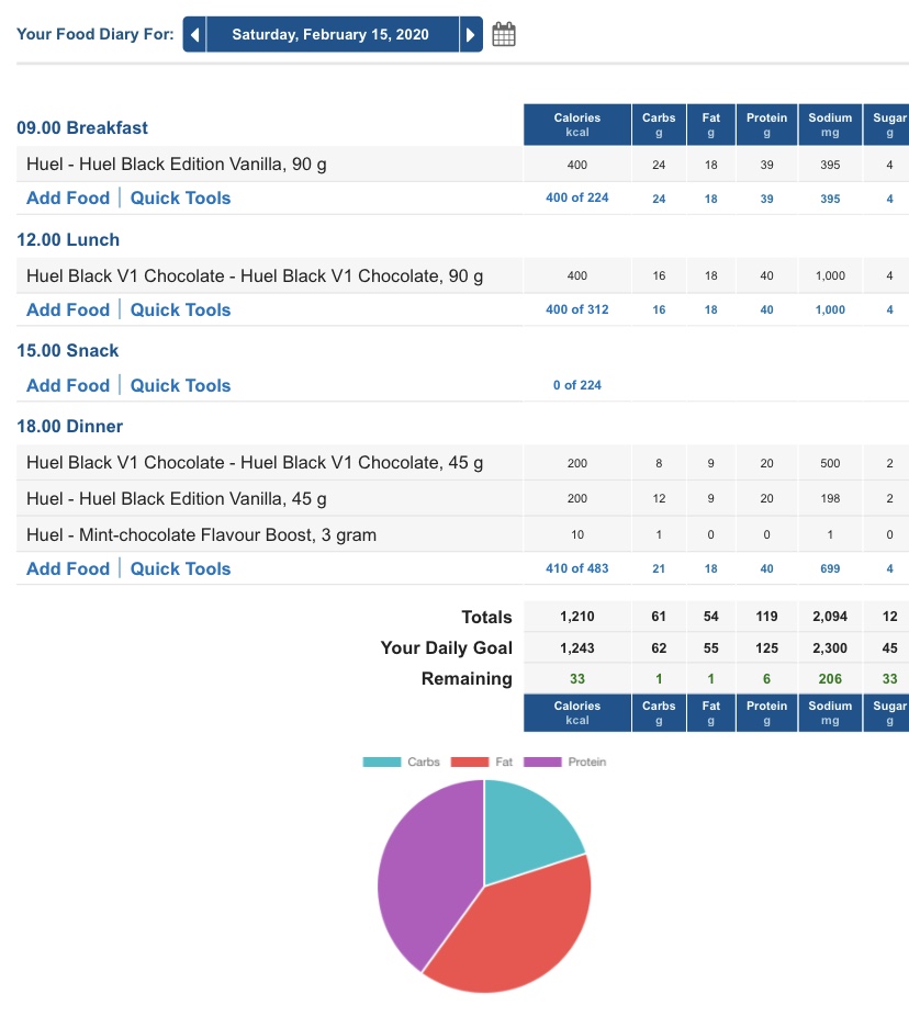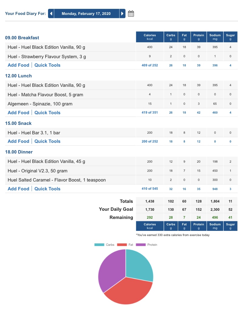 Today was another good day. Had a personal training this morning. A pretty intensive one. Did two Huel meals, one Huel snack and a regular meal.