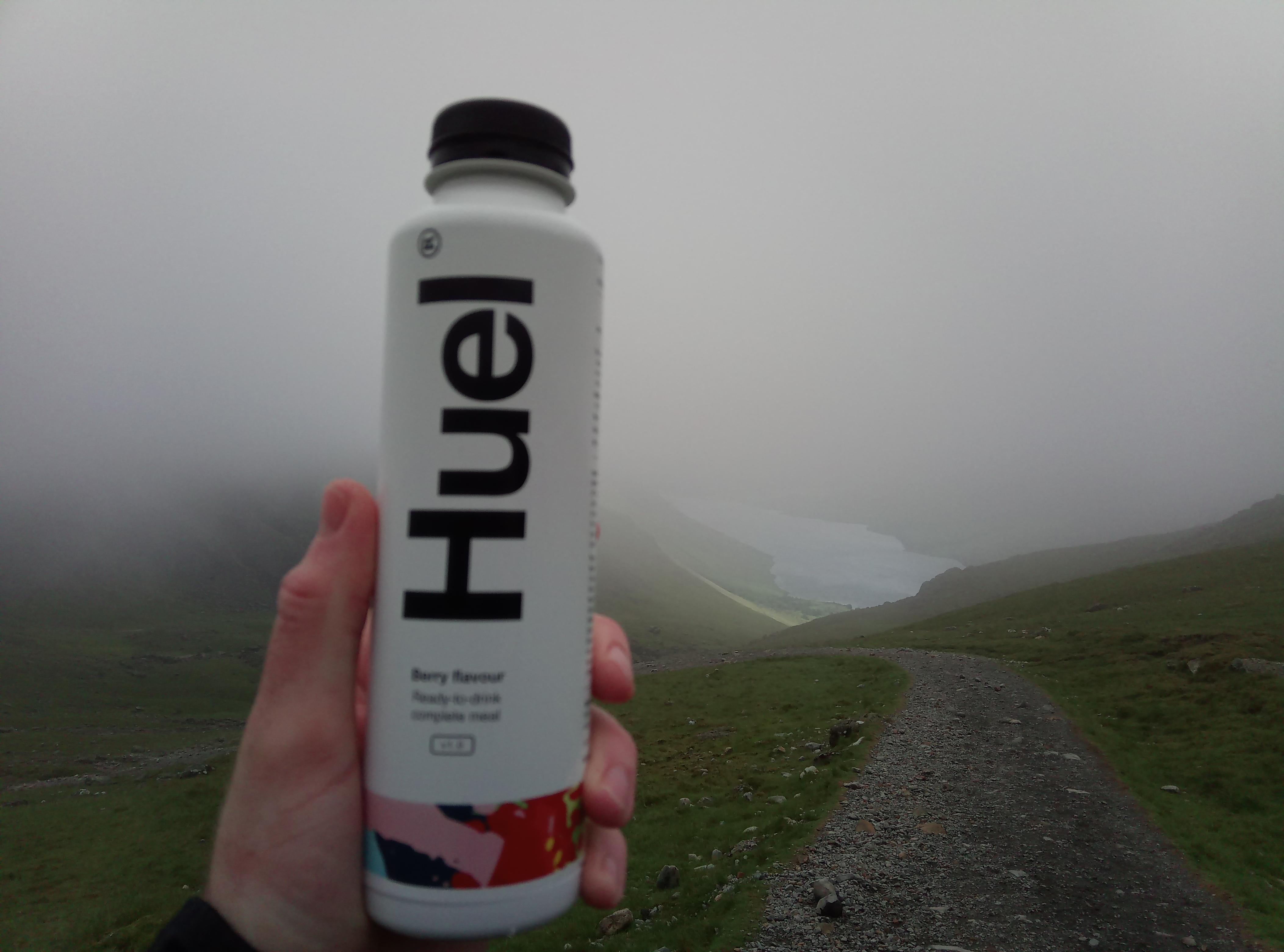 Weather conditions far from ideal with 50-60mph winds and very low visibility. Had a Huel before setting off and had two bottles in my bag for the climb/hike.